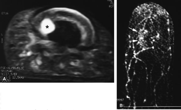 FIGURE 11.130 ● Mucoid-type glomus tumor. (A) Axial STIR image of a glomus tumor demonstrates very high signal in the lateral nail bed (asterisk). (B) On an MR angiogram, faint tumor enhancement is seen on delayed sequences (arrows).