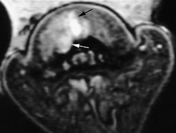 FIGURE 11.131 ● Mixed-type glomus tumor. Axial post-contrast 3D gradient-echo image of a glomus tumor shows a partial highly vascularized component close to the midline (arrows).