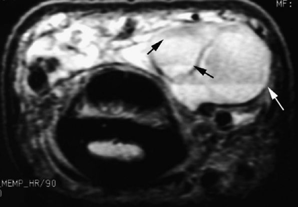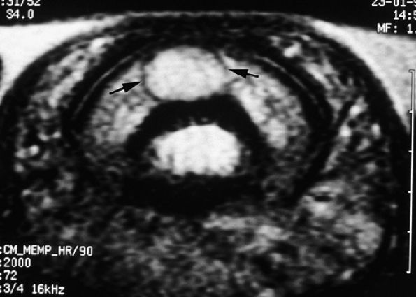 The mucoid type of glomus tumor is characterized by mucoid degeneration of the stroma, which demonstrates mild enhancement after gadolinium administration. On T2-weighted images it is seen with very high signal intensity because of the large amount of water in the stroma (Fig. 11.130). Recently it has been shown that this subtype of glomus tumor coexpresses alpha-smooth muscle actin and CD34 in neoplastic cells, an important finding regarding the differential diagnosis of these lesions and the relationship of perivascular neoplasms.299,300