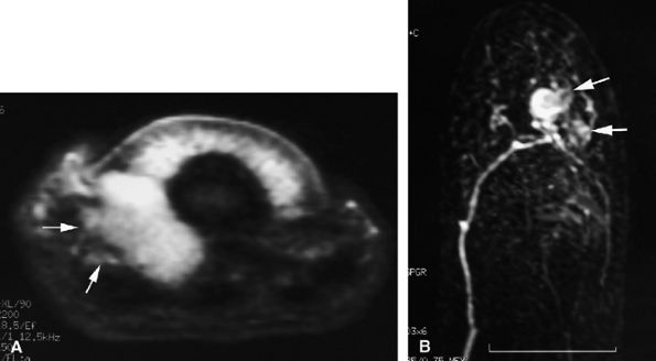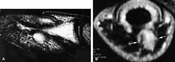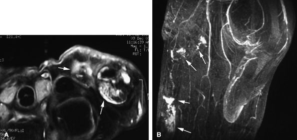FIGURE 11.133 ● The ill-defined margins of a glomus tumor shown on (A) an axial STIR image and (B) an MR angiogram. On the axial STIR image, a glomus tumor of the lateral part of the nail bed is seen extending toward the pulp via the rima ungualum (arrows). The lateral borders are not well defined. On the MR angiogram, the tumor also displays poorly defined lateral borders with lateral and proximal extension (arrows).