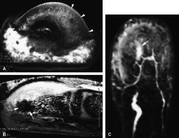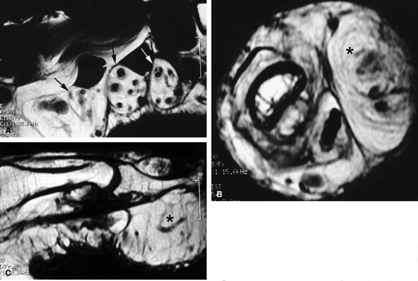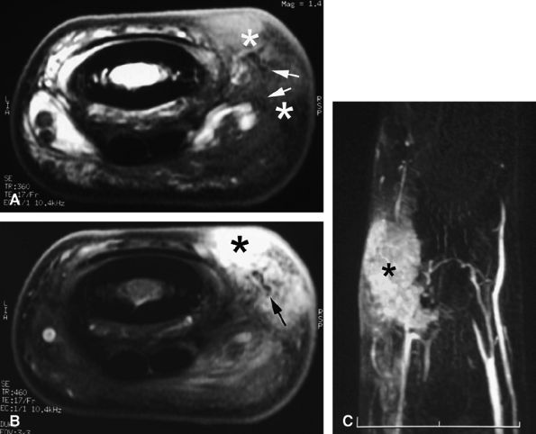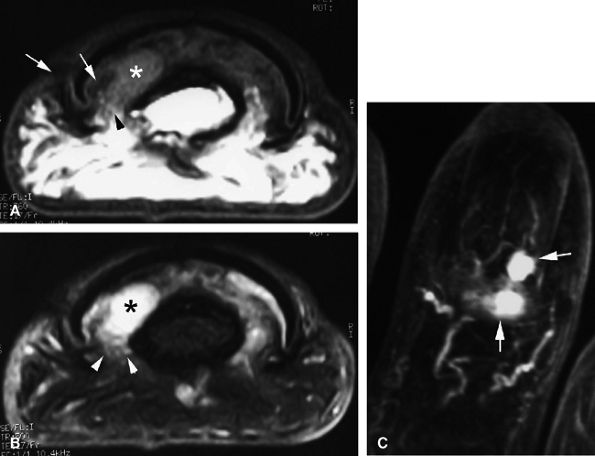 FIGURE 11.134 ● Postoperative recurrence of glomus tumor. Axial T1-weighted images before (A) and after (B) injection of gadolinium and (C) MR angiogram. Artifacts from the previous lateral surgical approach (arrows) can be seen, and there is tumor recurrence in the lateral part of the nail bed (asterisk). The lateral margins are blurred by scar tissue (arrowheads). On the MR angiogram, two contiguous tumors (arrows) can be seen. The proximal lesion displays ill-defined borders.