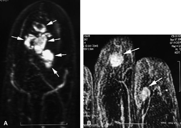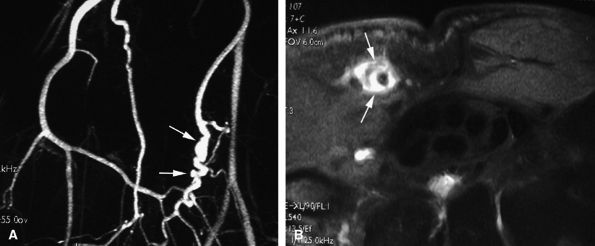 The vascular type is composed of numerous vascular lumens. Enhancement is very high after injection of gadolinium, and the signal is high on T2-weighted images.296 MR angiography shows early enhancement in the arterial phase that increases on the delayed venous acquisition (Fig. 11.128).297,298
