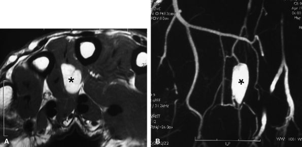 FIGURE 11.137 ● Glomus tumor, palmar location. (A) Axial post-contrast T1-weighted image and (B) MR angiogram of a glomus tumor located in the third intermetacarpal space (asterisks) between the interosseous and lumbrical muscles.