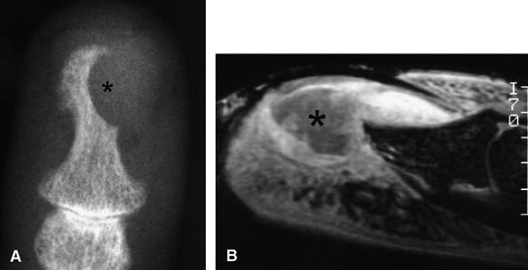 FIGURE 11.138 ● Keratoacanthoma. (A) PA view radiograph shows a well-defined lytic lesion of the distal phalanx (asterisk). (B) Sagittal post-contrast 3D gradient-echo image illustrates a deep infiltrating nodule with a central area of low signal (asterisk) invading the distal phalanx. The tumor borders are ill-defined and there is peripheral inflammation.