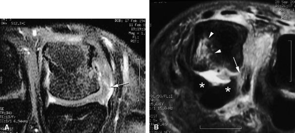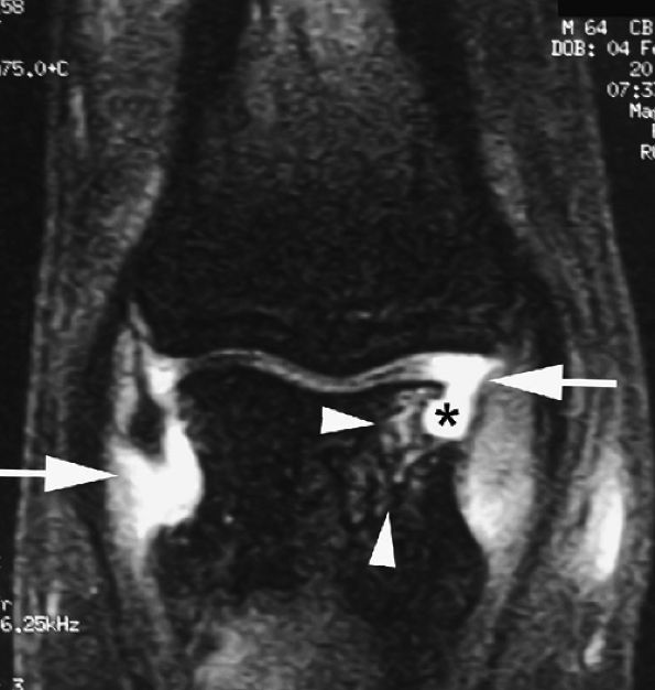 FIGURE 11.147 ● Erosive inflammatory arthritis of the PIP joint. Coronal post-contrast fat-suppressed T1-weighted images display enhanced synovium (arrows) and bone erosion (asterisk) with underlying bone edema (arrowheads).