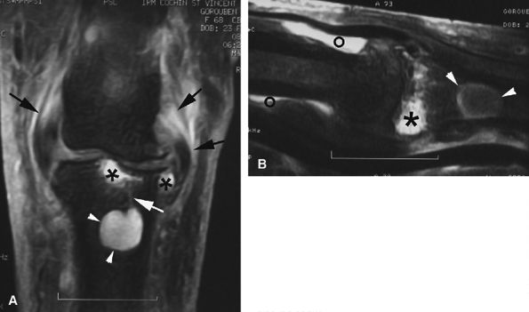 FIGURE 11.142 ● Osteoarthritis of the PIP joint on (A) a coronal proton density fat-suppressed image and (B) a sagittal post-contrast fat-suppressed T1-weighted image. Erosive osteoarthritis with foci of subchondral bone edema (asterisks), a bone cyst (arrowheads), and capsuloligamentous thickening (black arrows) are seen. A possible thin channel between the cyst and the joint (white arrow) or diffuse synovitis (small circles) may also be seen.