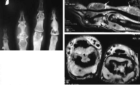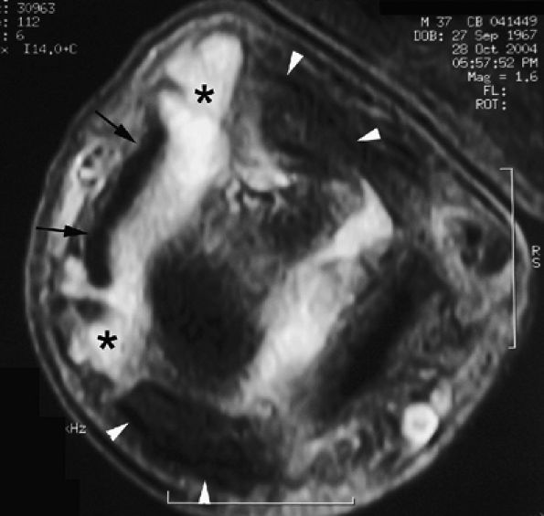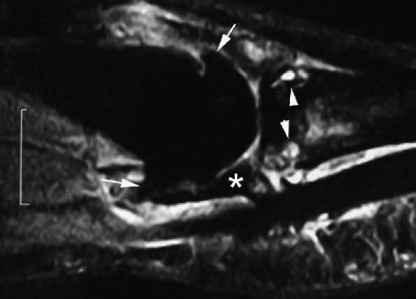 FIGURE 11.143 ● Osteoarthritis of the MP joint. Sagittal STIR image showing marginal osteophytes (arrows), subchondral bone edema (arrowheads), and degenerative lesions of the volar plate (asterisk) with irregular narrowing.