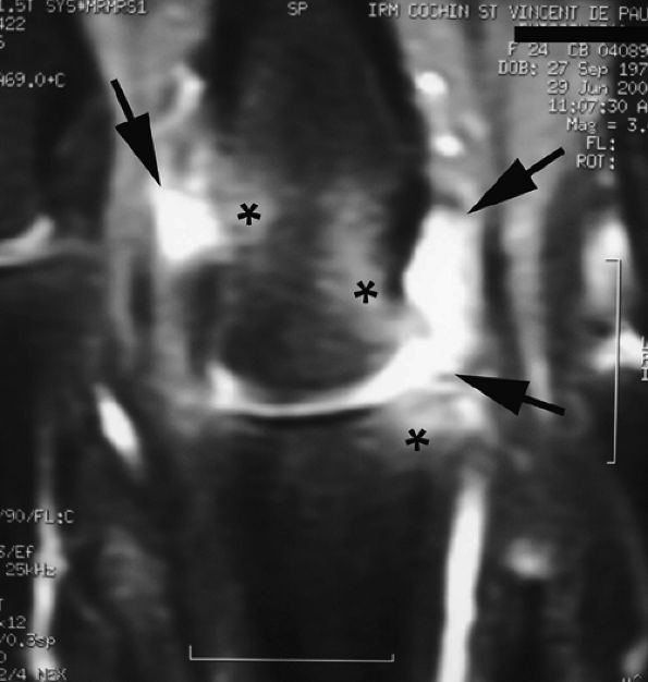FIGURE 11.146 ● Pre-erosive inflammatory arthritis of the metacarpophalangeal joint. Coronal post-contrast fat-suppressed T1-weighted image showing enhanced synovium (arrows) and associated bone edema (asterisks).