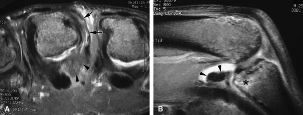 FIGURE 11.15 ● Axial (A) and sagittal (B) post-contrast fat-suppressed T1-weighted images display associated injuries of the ulnar collateral ligament (arrows) of the third metacarpophalangeal joint and the volar plate (arrowheads). Bone edema (asterisk) of the base of the proximal phalanx at the distal insertion of the volar plate can be seen.