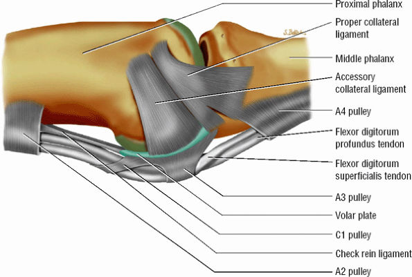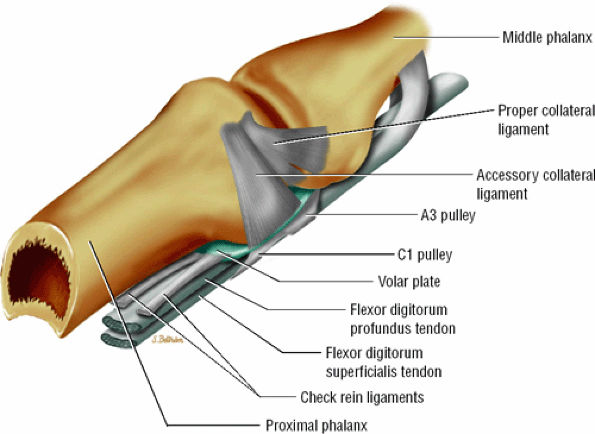FIGURE 11.16 ● Capsular ligaments of the proximal interphalangeal joint. The proper collateral ligament inserts on the base of the middle phalanx and partially on the volar plate. The accessory collateral ligament inserts on the lateral aspect of the volar plate and flexor tendon sheath.