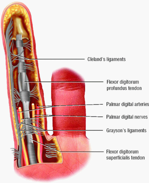 FIGURE 11.19 ● The cutaneous (Grayson's and Cleland's) ligaments. On this palmar view of the little finger, the ligaments are interlaced transverse and oblique fibers of connective tissue coursing between the skin and the flexor tendon sheath.