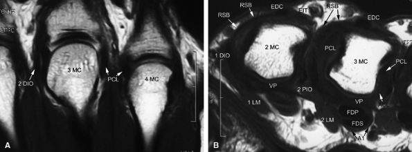 FIGURE 11.2 ● Metacarpophalangeal joints. (A) T1-weighted coronal image. (B) T1-weighted axial image. The proper collateral ligament (PCL) is lax in extension and shows heterogeneous signal intensity on coronal and axial images. ACL, accessory collateral ligament; VP, volar plate; LM, lumbrical; DIO, dorsal interosseous; PIO, palmar interosseous; MC, metacarpal; RSB, radial sagittal band; EDC, extensor digitorum communis; EIT, extensor indicis proprius tendon; FDS, flexor digitorum superficialis tendon; FDP, flexor digitorum profundus tendon; A1, A1 annular pulley.