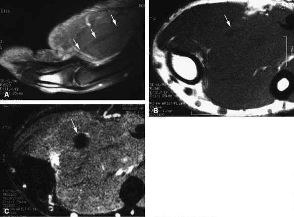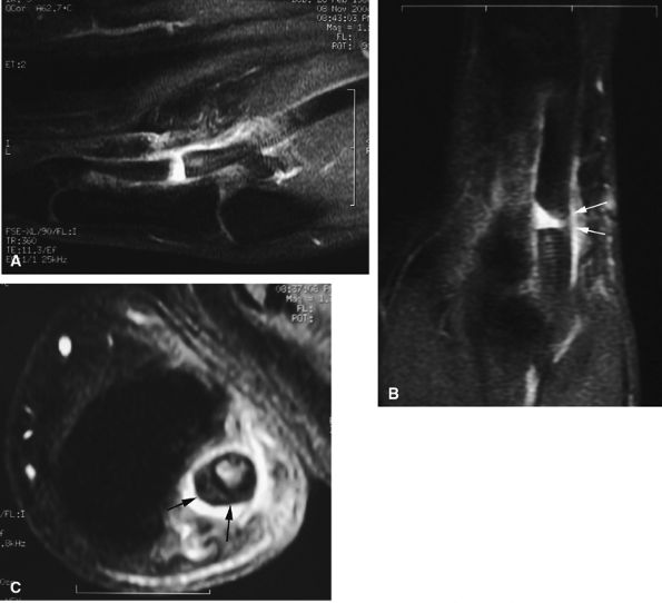 FIGURE 11.23 ● Magic angle phenomenon. The flexor pollicis longus tendon (arrows) with high signal intensity with short TE sequences on all imaging planes, as seen on (A) a sagittal fat-suppressed T1-weighted image and (B) an axial T1-weighted image. (C) On images with long TEs or STIR images, the signal of the tendon becomes normal.