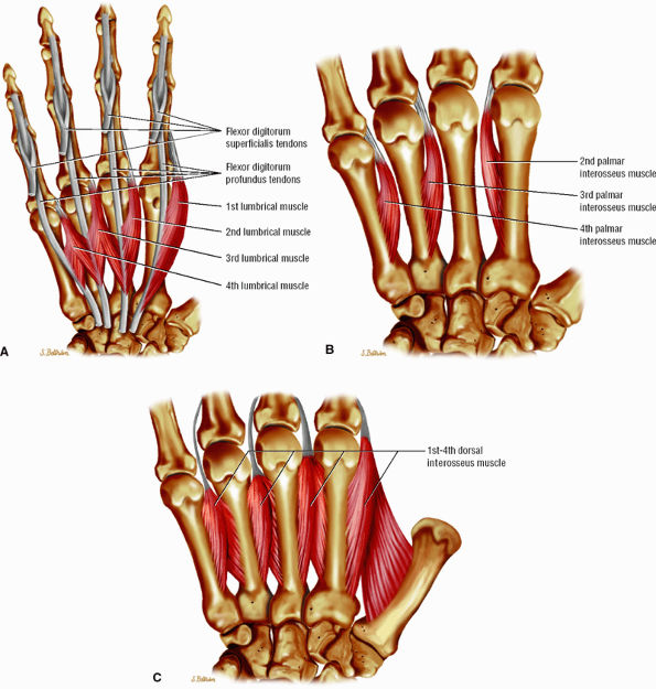 FIGURE 11.24 ● Intrinsic muscles of the hand. (A). Palmar view of the most common configuration of the lumbrical muscles. (B) Palmar view of the palmar interossei muscles. (C) Palmar view of the dorsal interossei muscles.