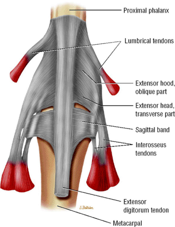 FIGURE 11.26 ● Extensor hood and sagittal bands. Dorsal aspect.