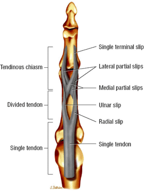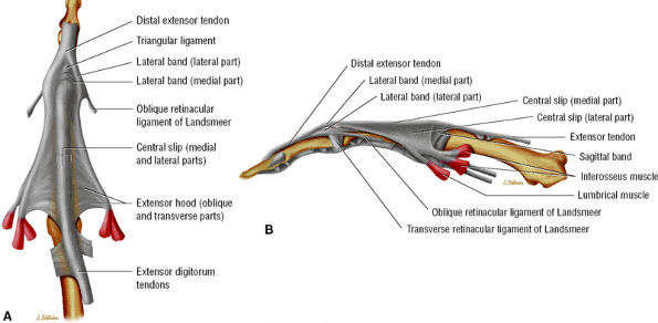 The tendons of the extensor apparatus are connected by the retinacular ligament (Landsmeer's ligament) at the level of the PIP joint and the middle phalanx (see Fig. 11.18).