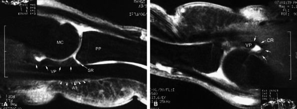 FIGURE 11.3 ● The volar plate of the metacarpophalangeal joint. (A) Midline and (B) parasagittal post-enhancement fat-suppressed sagittal T1-weighted images. VP, volar plate; SR, synovial recess; MC, metacarpal; PP, proximal phalanx; A1, A1 annular pulley; CR, checkrein.