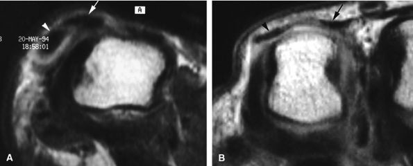 A partial tendon laceration appears as a thickened continuous tendon on sagittal and axial images, with partial intratendinous signal abnormalities. In evaluation of acute soft tissue injury associated with edema, T2-weighted and post-gadolinium-enhanced T1-weighted images are important (Fig. 11.28).