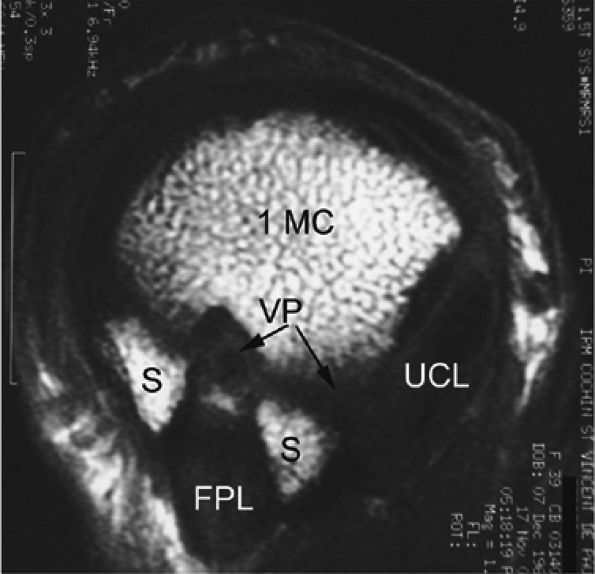 FIGURE 11.4 ● Volar complex of the thumb. Axial T1-weighted images. Sesamoid bones (S) are incorporated into the volar plate (VP). FPL, flexor pollicis longus; UCL, ulnar collateral ligament; 1MC, first metacarpal.