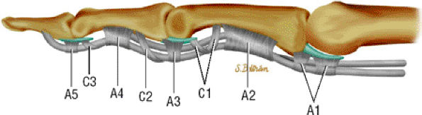 Grayson's ligaments) (Fig. 11.19). It delineates three compartments (dorsal, volar, and laterovolar), forming three bridges (see Fig. 11.18). The dorsal bridge includes the median slip and the lateral bands of the extensor tendon, the Landsmeer's transverse ligament and the ACL. The volar plate constitutes the middle bridge. The volar bridge is formed from the annular A3 pulley, and Cleland's and Grayson's ligaments.