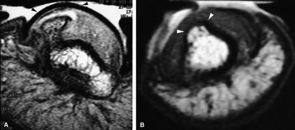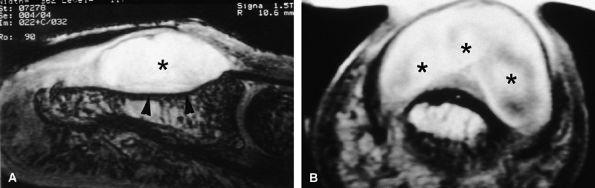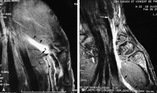 FIGURE 11.117 ● Mucoid pseudocyst. Sagittal (A) and axial (B) T2-weighted images depicting a small cyst (arrows) seated in the matrix cul-de-sac with compression of the dorsal and intermediate matrix (arrowheads).