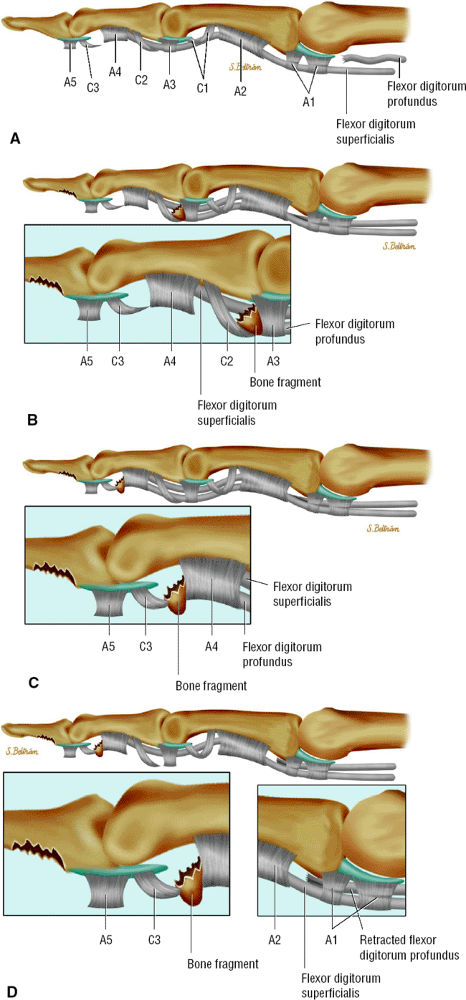The extensor hood, particularly the sagittal bands, stabilizes the MP joint and the extensor tendon during flexion (see Fig. 11.2).12
