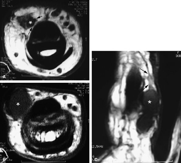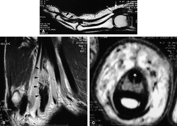 FIGURE 11.139 ● Onychomatricoma. Sagittal (A) and axial (B) T1-weighted images show the tumor core (asterisk) in the matrical area and invagination of the lesion into the funnel-shaped nail plate (arrows). Distal filamentous expansions (arrowheads) are better depicted on the axial image.