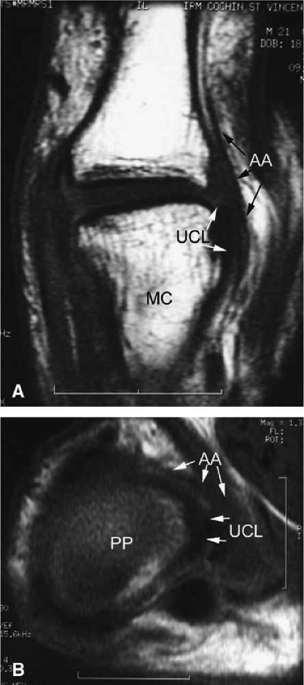 FIGURE 11.5 ● Coronal (A) and axial (B) T1-weighted images showing the ulnar collateral ligament (UCL) and adductor aponeurosis (AA). The UCL is deeper than the AA on axial images. On coronal images, the oblique AA is often more visible distal to the UCL. MC, metacarpal; PP, proximal phalanx.