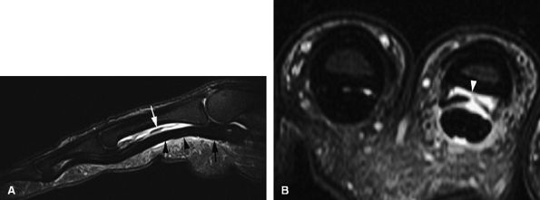 FIGURE 11.22 ● Associated injuries of the volar plate and a collateral ligament of the PIP joint. (A) Sagittal T1-weighted and (B) axial post-contrast fat-suppressed T1-weighted images show proximal injury of the checkreins of the volar plate with associated synovitis (white arrows). Continuity of the central slip of the extensor tendon is seen (arrowheads), and there is a tear of the radial collateral ligament (asterisk).