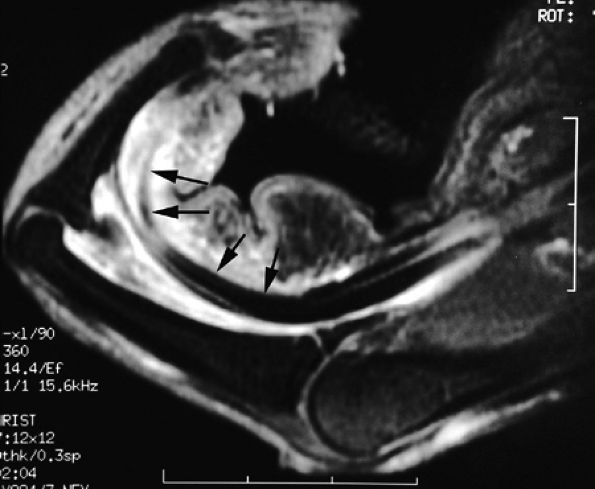 Sagittal and axial plane images are complementary. The normal synovial recess at the distal insertion of the volar plate must not be confused with a tear (see Fig. 11.3). The volar plate is also easy to assess with ultrasonography, which allows a useful dynamic study with flexion-extension of the joint. -