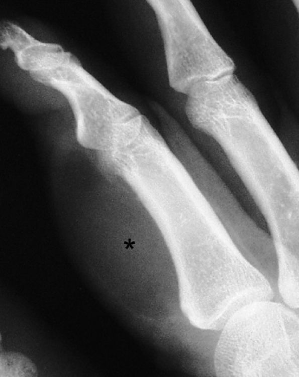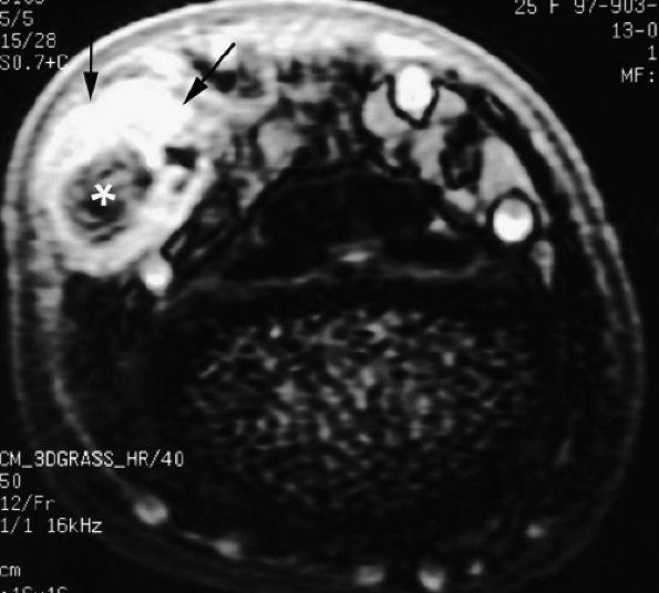 FIGURE 11.126 ● Epidermal inclusion cyst of the posterior nail fold. Sagittal 3D gradient-echo image displays a polylobed cyst of the posterior nail fold (arrows) with intralesional septa. Note the artifact (asterisk) from a previous trauma.