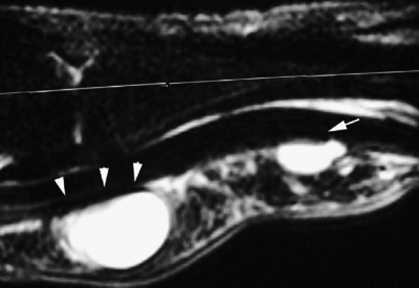 FIGURE 11.122 ● Subungual mucoid pseudocysts. Sagittal T2-weighted image of bilobed cysts. There is a proximal cyst in the posterior nail fold (arrow) and a distal cyst in the nail bed (arrowheads).