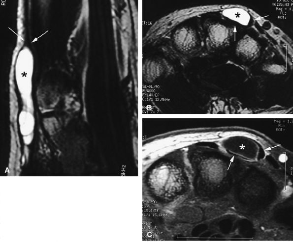 FIGURE 11.144 ● Heberden's nodes. Axial proton density fat-suppressed image shows capsulosynovial herniation (asterisks) through the space between the extensor tendon (arrows) and the collateral ligaments (arrowheads).