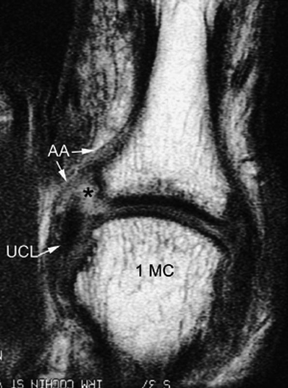 FIGURE 11.7 ● Coronal post-contrast T1-weighted image showing a nondisplaced tear of the UCL of the first metacarpophalangeal joint (MP) joint. The torn UCL is elongated beneath the adductor aponeurosis (AA). There is focal enhancement of the tear (asterisk). 1 MC, first metacarpal.