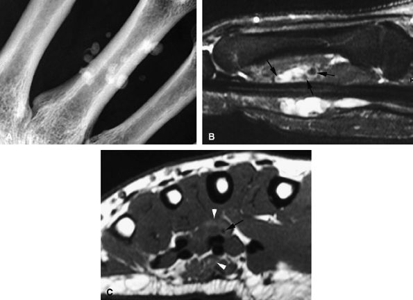 FIGURE 11.99 ● Osteoid osteoma of the distal phalanx. (A and B) The calcified nidus appears as a focus of low signal intensity (arrows), and associated asymmetric inflammatory thickening of the nail bed can be seen (arrowheads). (C) MR angiography demonstrates hypervascularization of the nidus on delayed sequences (arrow).