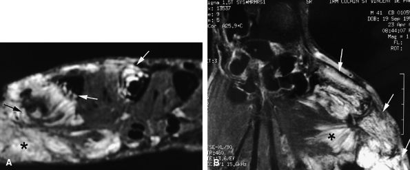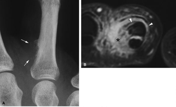 FIGURE 11.95 ● Florid reactive periostitis. (A) PA view radiograph of a paraosseous mass with sparse calcifications (arrows) and compact periosteal reaction. (B) Axial post-contrast fat-suppressed T1-weighted image showing a large inflammatory reaction in the soft tissues (asterisk) and an aggressive periosteal reaction with phalanx integrity (arrowheads).