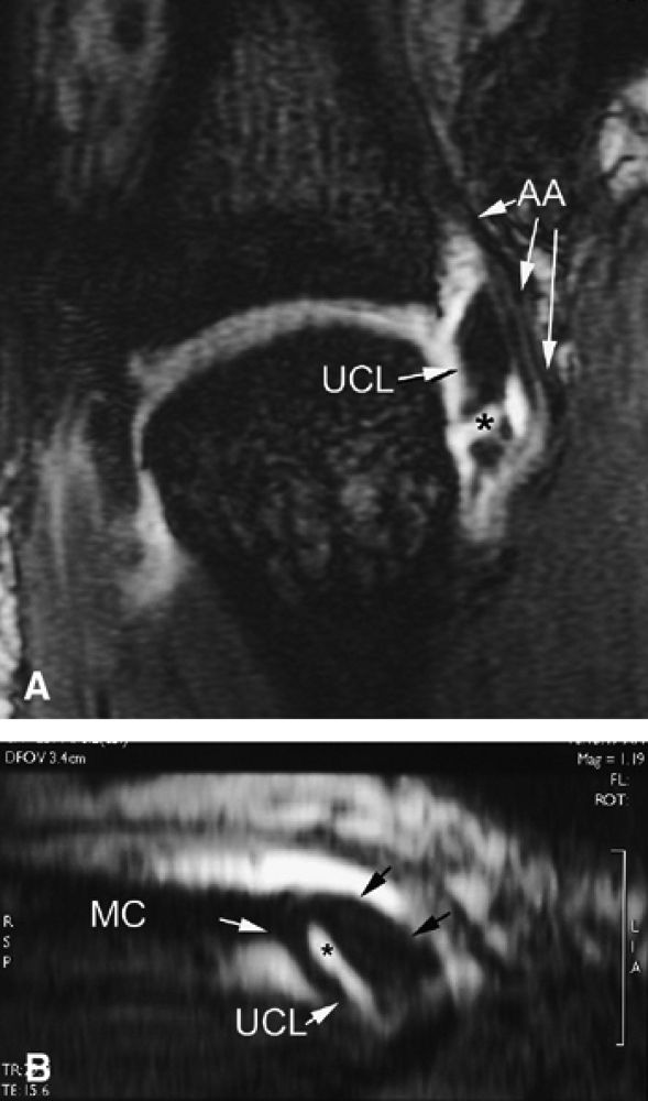 maneuvers alone a nondisplaced lesion may be misdiagnosed as a displaced one, and both ultrasonography and MR imaging may be useful (optimally before 2 weeks) in making the diagnosis.16 MR imaging and MR arthrography are both accurate in the detection of a Stener's lesion.15,17,18,19 Coronal fast spin-echo T2-weighted images are the most informative.20,21 The identification of a displaced versus a nondisplaced ligament is not straightforward, and a spectrum of UCL injuries may be depicted. Differentiation is more difficult in chronic lesions.20,22 Characteristic MR findings include the following: