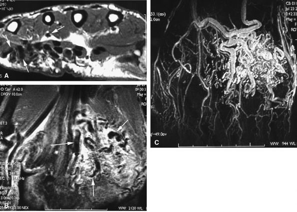 FIGURE 11.135 ● Multiple glomus tumors. (A) MR angiogram depicting five glomus tumors in the same fingertip (arrows). (B) MR angiogram in a separate case shows glomus tumors of the fingertips of two adjacent fingers (arrows).