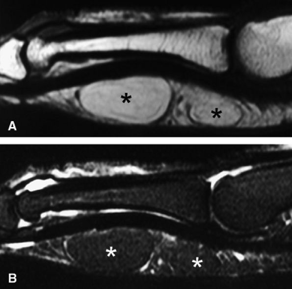 FIGURE 11.121 ● Subungual mucoid pseudocyst. Sagittal STIR (A) and post-contrast T1-weighted (B) images of a cyst seated in the nail bed (asterisks) with slight peripheral enhancement after contrast administration. The nail matrix and the nail bed (arrows) are lifted by the cyst. Slight pressure bone erosion of the distal phalanx (arrowheads) can also be seen.