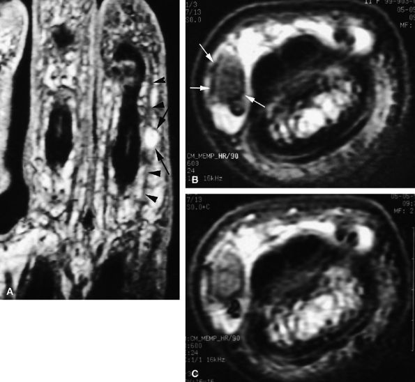FIGURE 11.129 ● Solid-type glomus tumor. (A) Axial T2-weighted image. T1-weighted image before (B) and after (C) injection of gadolinium. The tumor is in the lateral part of the nail bed (arrows) and is faintly visible on all sequences.