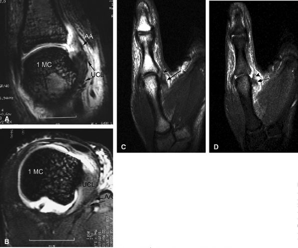 FIGURE 11.9 ● MR of Stener's lesions. MR arthrograms. Coronal (A) and axial (B) T1-weighted fat-suppressed 3D gradient-echo images. The UCL is retracted proximally with a mildly horizontal orientation. The adductor aponeurosis (AA) is partially beneath the UCL. 1 MC, first metacarpal. A more classic Stener's lesion depicted on a coronal proton density-weighted image (C) and a fat-suppressed coronal proton-density weighted image (D), which demonstrate the UCL (arrow) torn from its distal attachment and extending perpendicular to the first ray. The adductor aponeurosis (arrowhead) is seen as a linear structure distal and deep to the torn and retracted UCL.