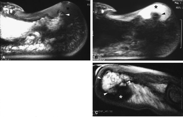 tissue and tumor. On T1-weighted images the low-signal-intensity tumor is seen, surrounded by high-signal-intensity fat. After gadolinium administration, tumor enhancement is only visible on fat-suppressed images (see Fig. 11.136).