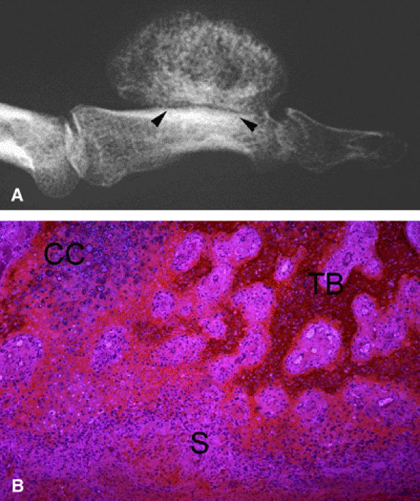 FIGURE 11.96 ● Bizarre paraosteal osteochondromatous proliferation (BPOP). (A) Oblique view radiograph shows features similar to an osteochondroma but with an intact underlying cortex (arrowheads). (B) Histologically there is variable association of a less organized cartilage cap than in osteochondroma, maturing trabecular bone, and fusiform cells without cellular atypia in the stroma.