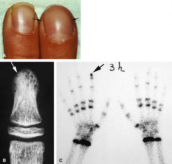 FIGURE 11.97 ● Osteoid osteoma of the distal phalanx of the index finger. (A) Dorsal aspect of the fingertip showing clubbing (arrows). (B) PA view radiograph showing osteosclerosis of the distal tuberosity of the phalanx (arrow), blurring the detection of a nidus. (C) Tc99 bone scan depicting delayed uptake of the fingertip of the index finger (arrow).