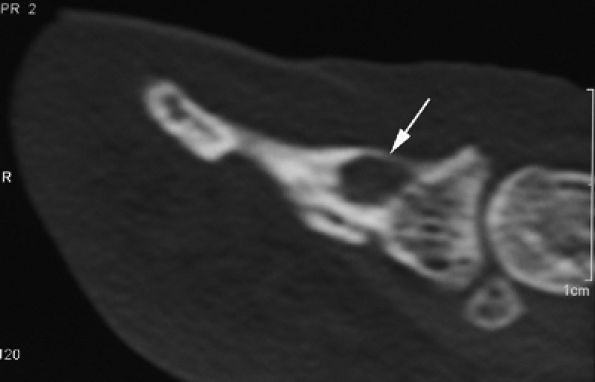 FIGURE 11.98 ● Osteoid osteoma of the distal phalanx. CT scans showing the osteolytic noncalcified nidus (arrow).