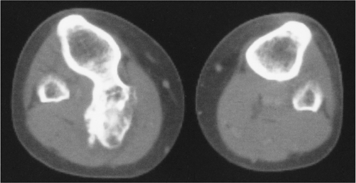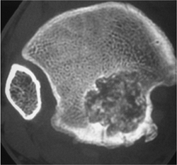 Matrix calcifications. Axial CT image of the distal tibial epiphysis showing a well-defined geographic lesion with calcifications. Appearance and location characteristic of chondroblastoma. |