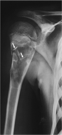 FIGURE 10-3 Permeative. Poorly defined lytic lesion in the proximal humerus with permeative cortical changes attributable to Ewing sarcoma.