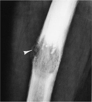 FIGURE 10-5 Periosteal response. Osteogenic sarcoma with bone sclerosis and cortical break: a triangular elevation (arrow) (Codman triangle) seen with aggressive lesions.