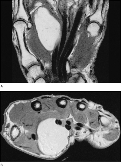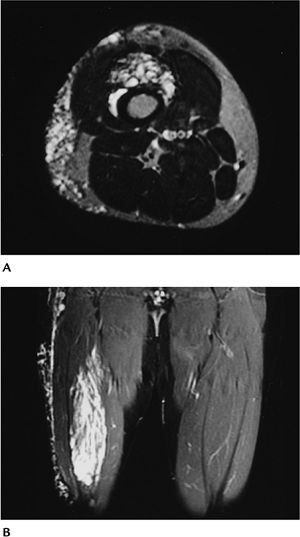 FIGURE 10-60 Rhabdomyosarcoma in a 3-month-old girl. Axial T2-weighted (A) and coronal gradient-echo (B) weighted MR images showing a high signal intensity muscle mass caused by an embryonal rhabdomyosarcoma.