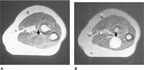 FIGURE 10-56 Acute hematoma. (A) T1-weighted axial MR image showing a muscle density mass (arrows). (B) The hematoma is high intensity on the T2-weighted image.